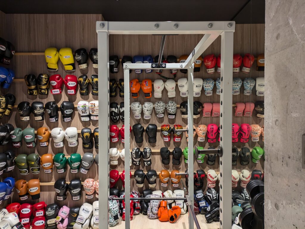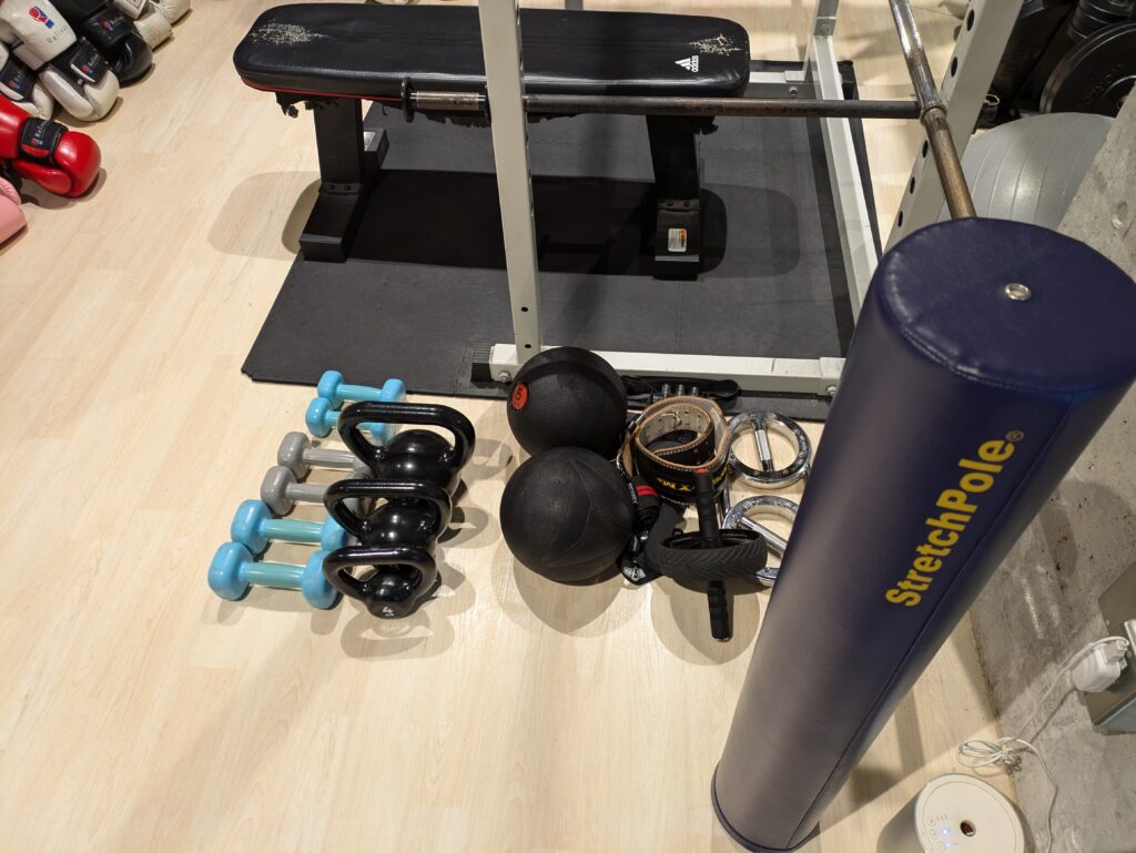フロアの端にはグローブ、パワーラック、ストレッチグッズ、ケトルベルやダンベルなどのトレーニンググッズが置かれています。